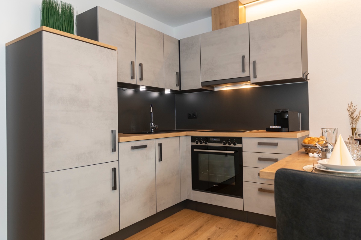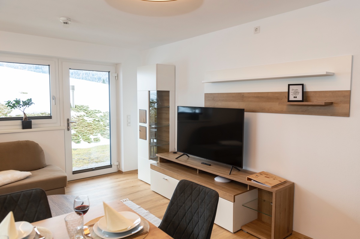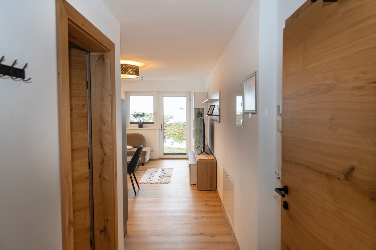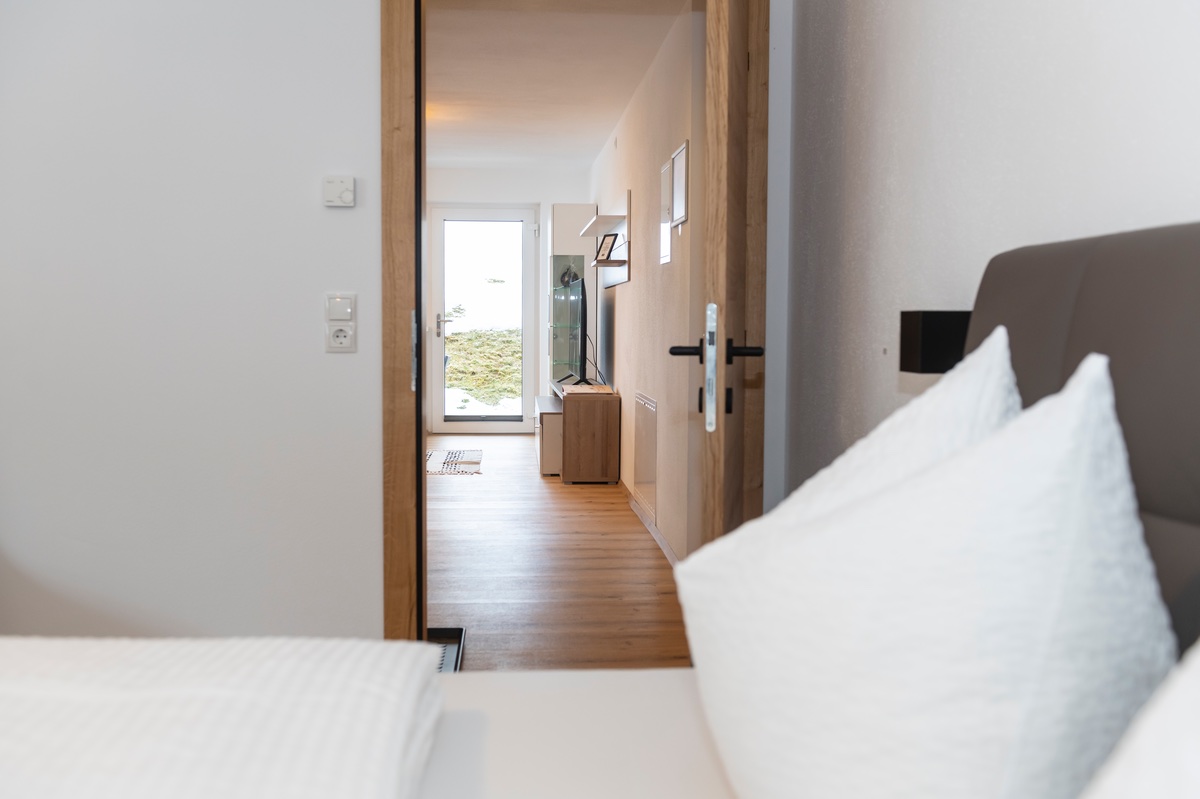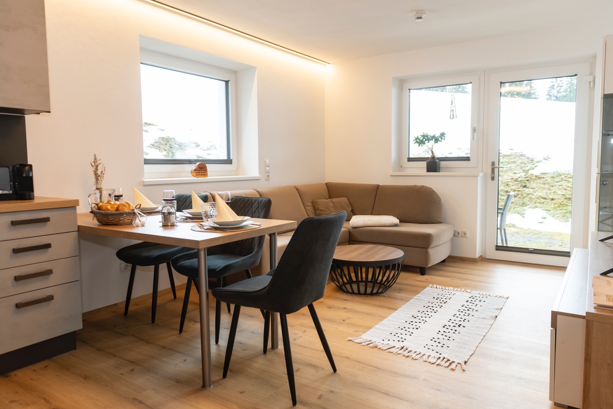 Neues topmodernes Garten-Apartment mit einem Schlafzimmer. Ideal für zwei Personen, aber auch für Familien mit einem Kind, das auf der Couch schläft.