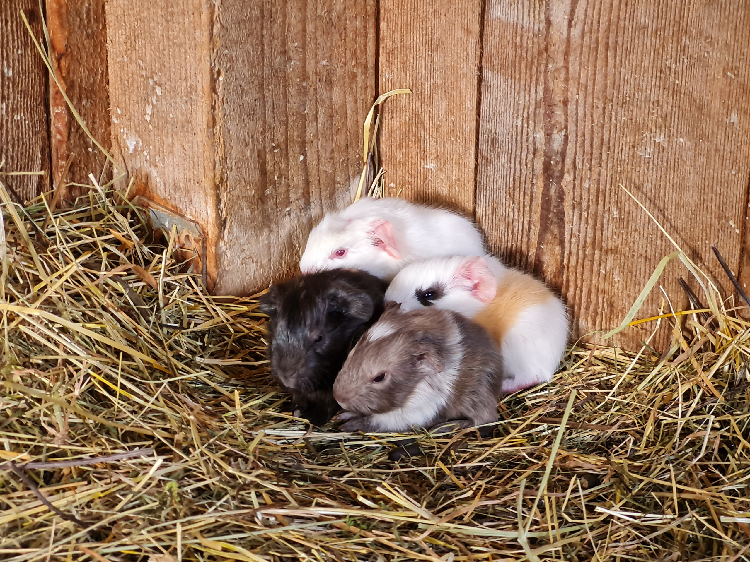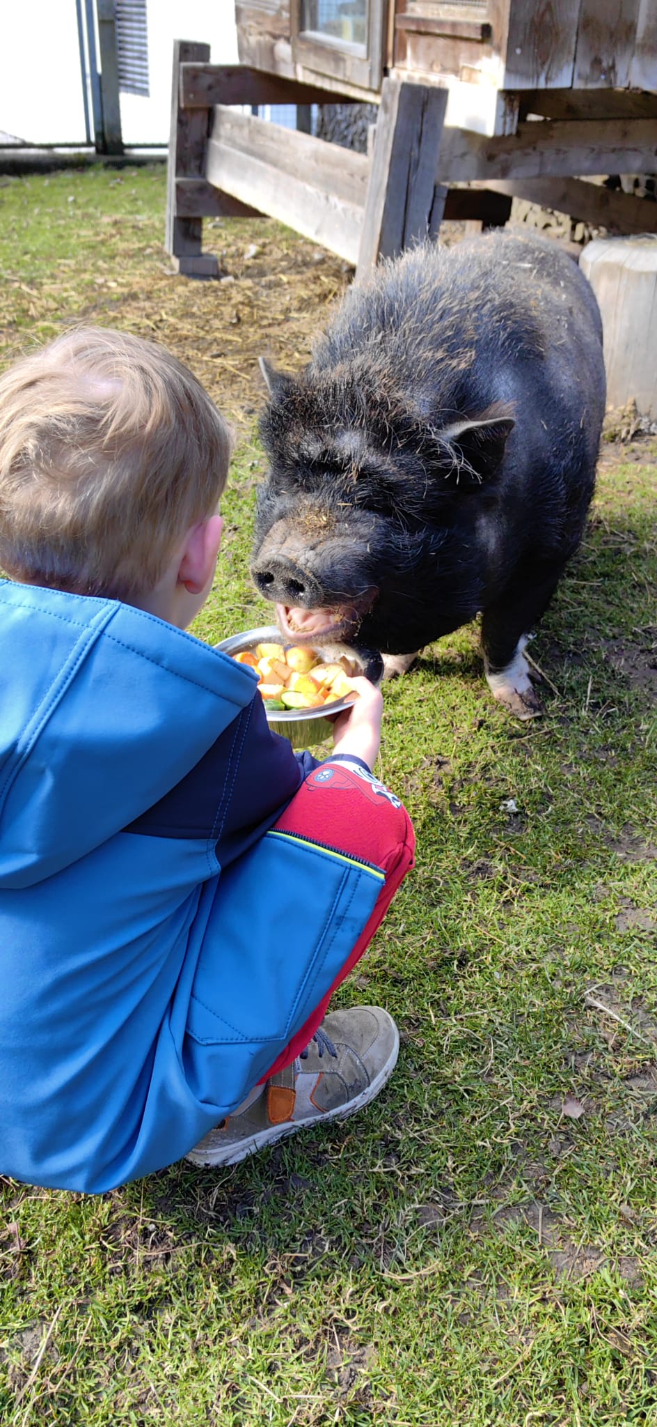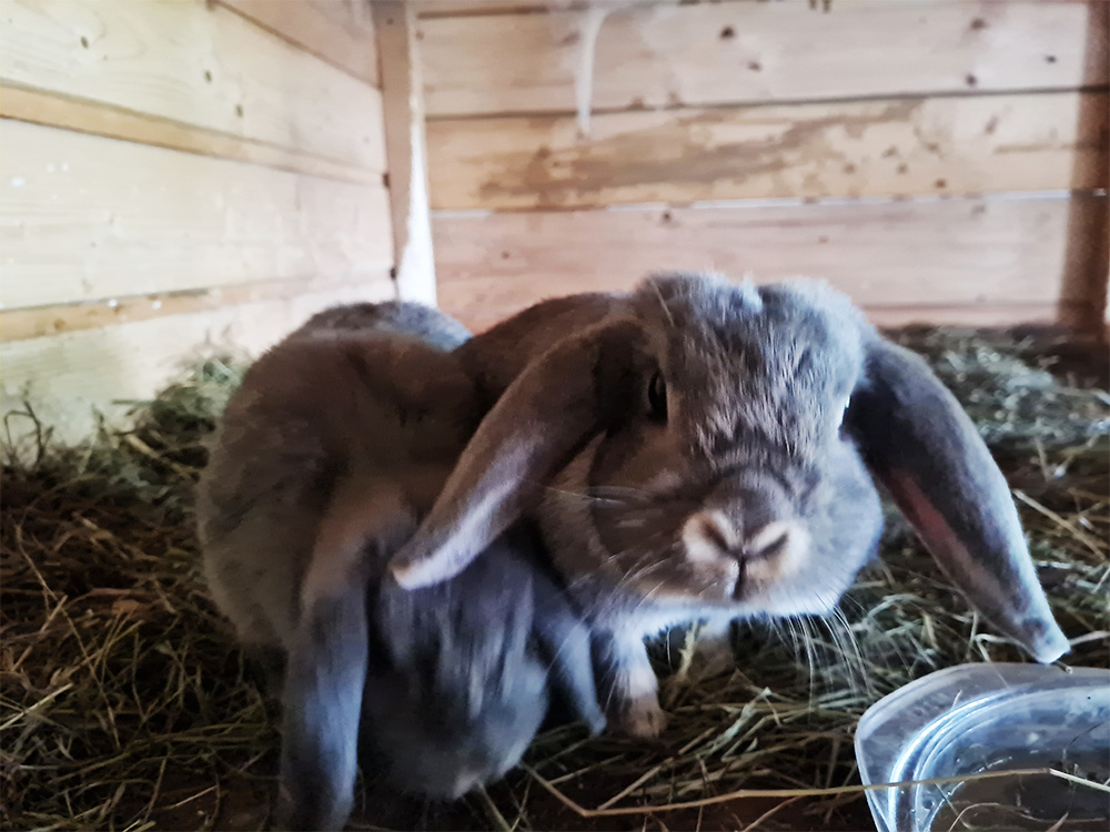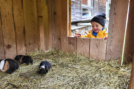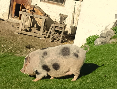 Hinter unserem Haus befindet sich ein großzügiger Streichelzoo mit Ziegen, Hasen, Hühnern, Meerschweinchen und unseren Hängebauchschweinchen Gusti und Franzi.